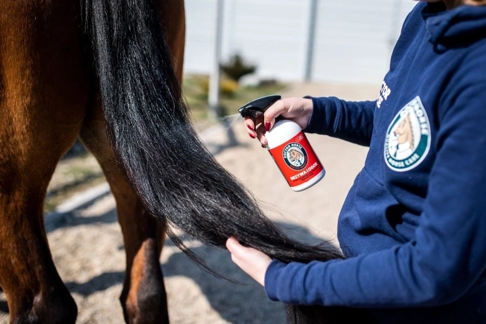 2️⃣ Hrivu a chvost naneste štedro a rovnomerne sprejom.